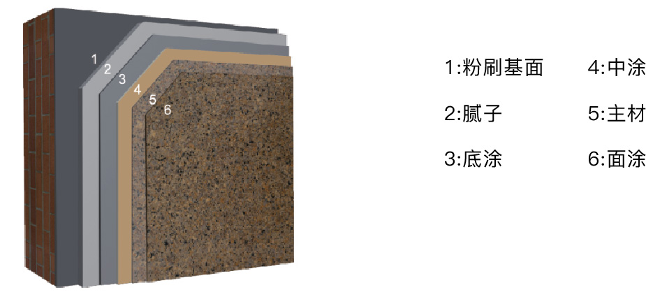 以水溶性高分子聚合物和無(wú)機(jī)顏料共聚而成的一種液態(tài)裝飾材料,采用現(xiàn)代化噴涂設(shè)備,呈現(xiàn)出豐富多彩的石材效果飾面。